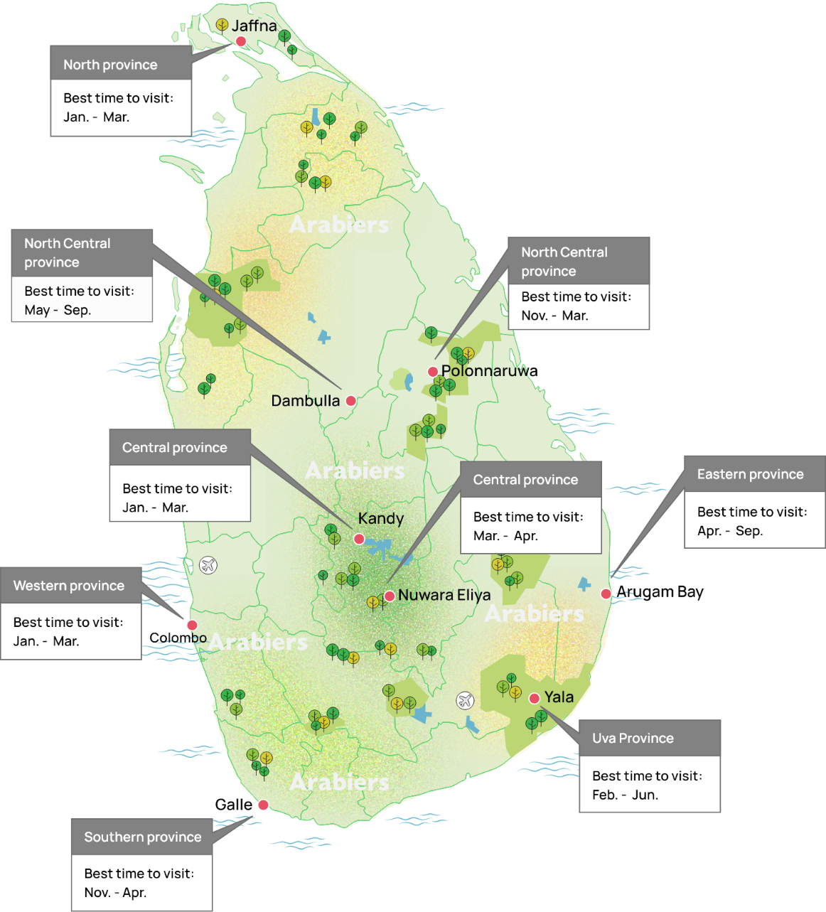 Sri Lanka experiences two monsoons which influence the climate of the region. The best time to visit Sri Lanka basically depends on the region you will be visiting and the activities you plan to engage in.